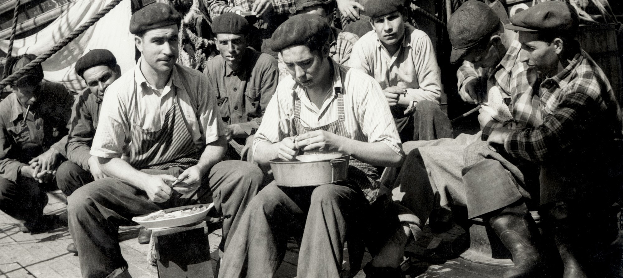 As refeições a bordo dos navios de pesca à linha do bacalhau variavam consoante o navio seguia viagem ou se encontrava no pesqueiro e eram constituídas por três momentos. Assim, durante a viagem eram servidas três refeições: o almoço (às 7h30 da manhã quando se rendia o quarto), o jantar (entre as 11h30 e as 12h00) e a ceia (entre as 18h30 e as 19h00). Quando se encontravam na faina e o trabalho era árduo, os intervalos das refeições eram, substancialmente, alterados: o almoço - servido antes d’Os Louvados, por volta das 4h00 (ou mais tarde quando a abundância do bacalhau justificava jornadas de trabalho que terminavam, por volta, das 05h00), a refeição preparada para os pescadores levarem no foquim, o jantar – a anteceder a escala -, e por fim, a ceia, servida após a escala do bacalhau pescado nesse dia. Servidas em dois turnos, quando o navio se encontrava na zona de pesca, primeiro comiam os escaladores e depois os salgadores. As refeições eram acompanhadas por vinho – aqueles que o levavam -, por água (servida na depa), chá ou café feitos diariamente e servido nas canecas de esmalte.