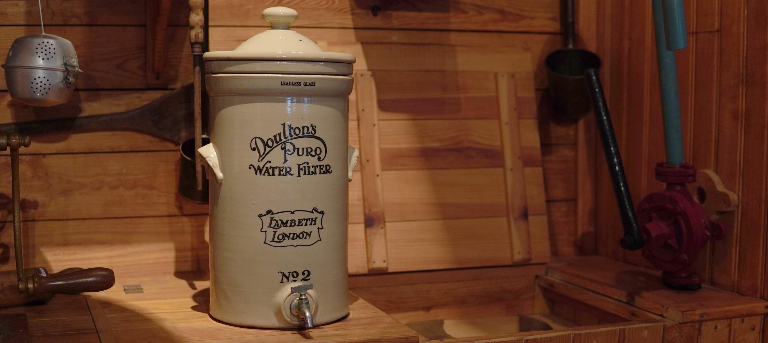 Filtro de água por gravidade, de forma cilíndrica em cerâmica vidrada fabricada em Inglaterra, é constituído por tampa, depósito amovível e caldeira. A tampa apresenta-se em forma de campânula, com aba e aro de encaixe, que na parte superior possui três orifícios e pega em forma de botão achatado. O depósito amovível (filtro), de forma cilíndrica, é constituído por uma aba que encaixa na parte superior da caldeira ficando suspenso; no interior tem duas pequenas pegas que servem para retirar o filtro, visto que, ao centro encontra-se o diatomito (peça porosa que filtra a água). A caldeira tem duas asas laterais ornamentadas e junto à base, na zona frontal, apresenta uma torneira com manípulo, por onde era servida a água.